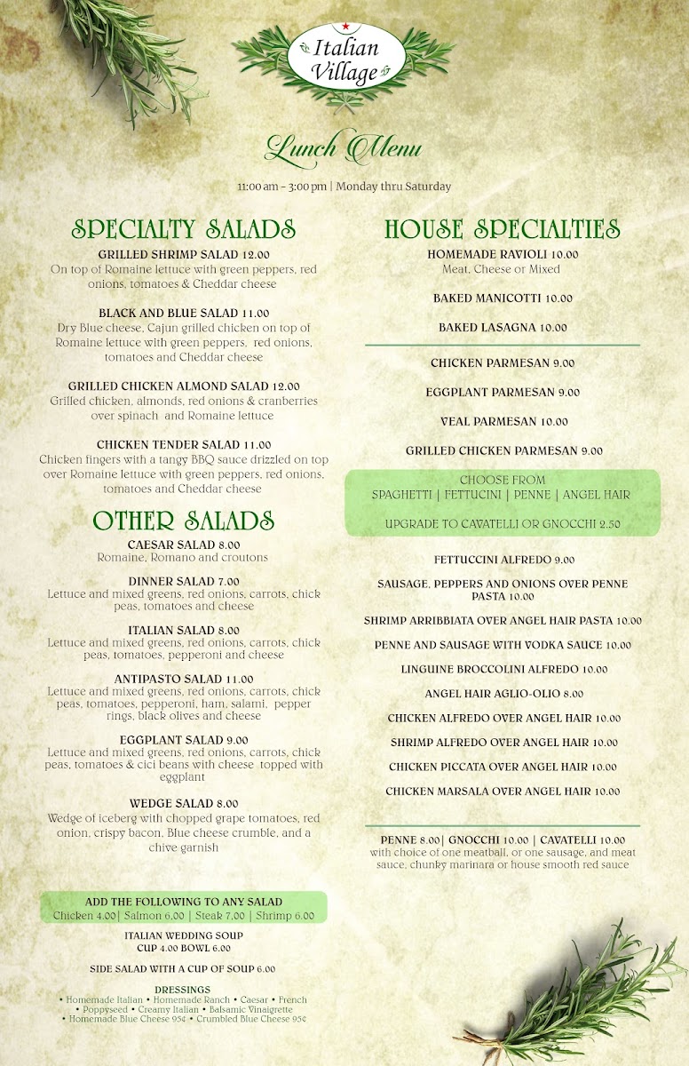 Choose from penne, spaghetti, fettucine or angel hair. With choice of one meatball or one sausage and meat sauce, chunky marinara or house smooth red sauce.